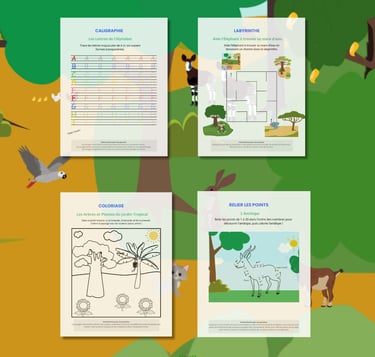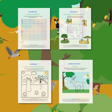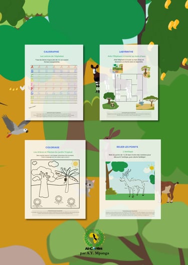 Ce cahier d'activités ludique et éducatif est parfait pour les enfants de 3 à 6 ans. Il invite les petits à explorer les merveilles de l'Afrique à travers des activités variées comme des coloriages, des labyrinthes, des puzzles, des jeux des différences, et des exercices de comptage.